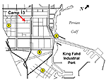 Eight remote sensor stations monitored the air quality within the vicinity of Al Jubaylseven stations located at various locations within Al Jubayl and the eighth monitoring station at KAANB. A mobile monitoring unit was also available. Figure 26 shows monitoring stations located within the immediate industrial area and port area during the war. The fixed stations had an equipment trailer and a sampling tower surrounded by a security fence. Each sampling tower had sensors installed at heights of 10, 50, and 90 meters (33, 164, and 296 feet respectively). The automated monitoring process relied on sensor data fed to on-site computers and transmitted to a central monitoring station every five minutes. Compiled on an hourly, daily, monthly, and yearly basis, the sensor data was compared to the Royal Commissions standards.