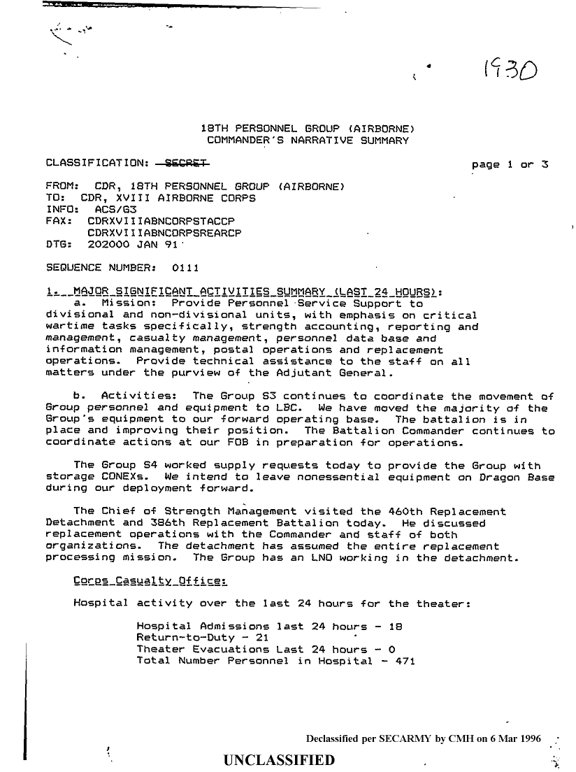 Document 3 f:/Week-08/BX000015/DUTY LOG 18 PER GP SITREPS G3 JAN 91/major significant activities summary 202000 jan 91:04109619191910
