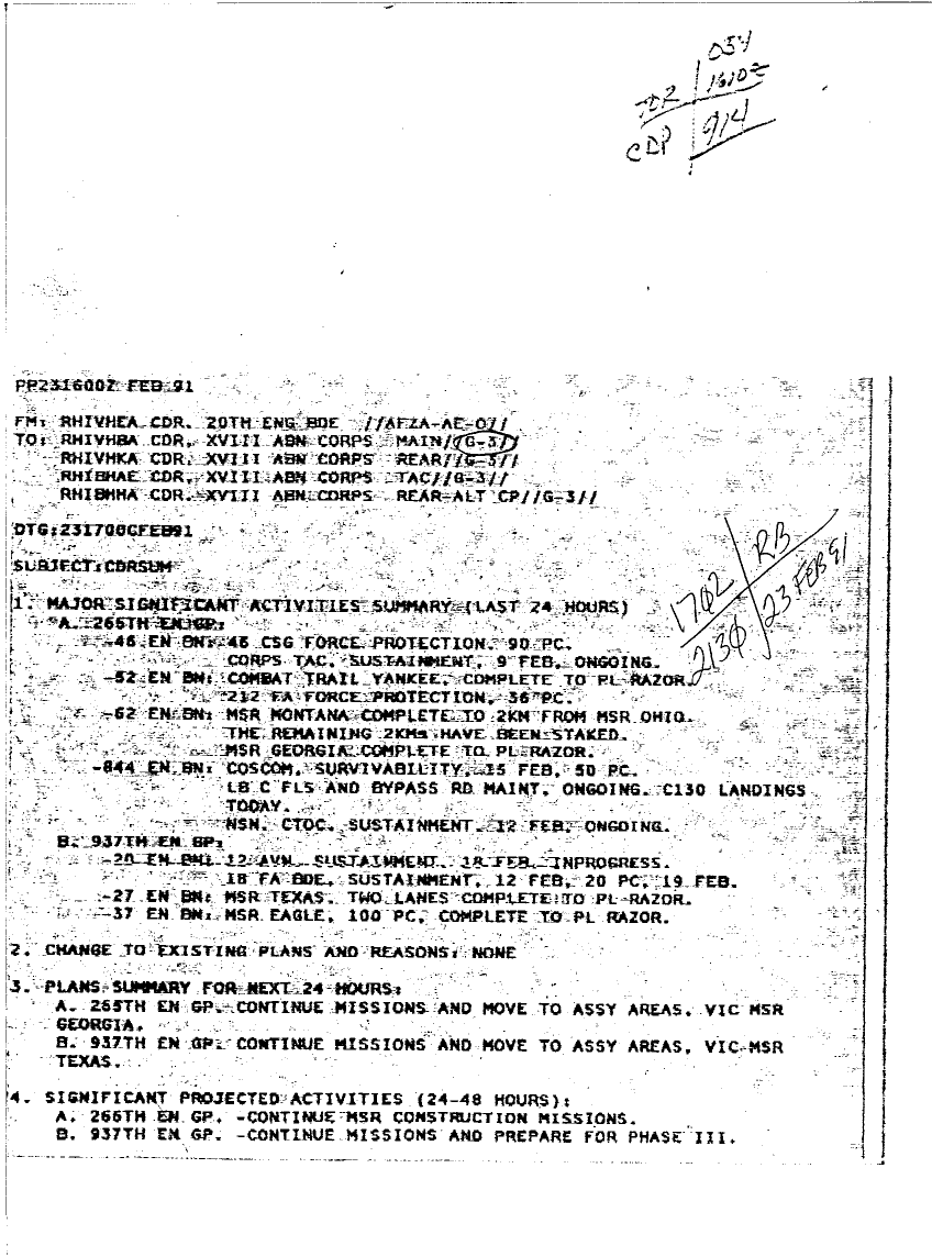 Document 2 f:/Week-08/BX000015/DUTY LOG 20 ENG BDE SITREPS G3 FEB 91/commanders narrative summar:0410961919191