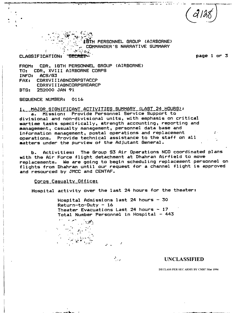 Document 3 f:/Week-08/BX000015/DUTY LOG 18 PER GP SITREPS G3 JAN 91/major significant activities summary 252000 jan 91:0410961919192