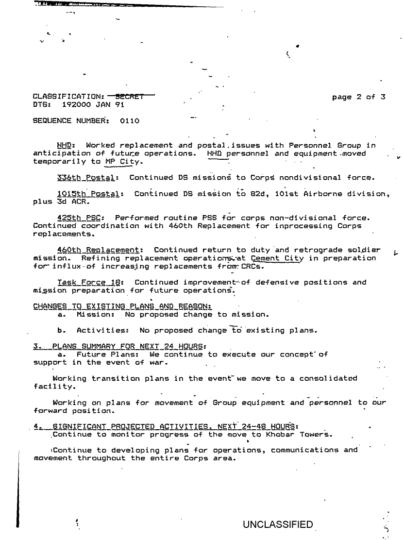 Document 3 f:/Week-08/BX000015/DUTY LOG 18 PER GP SITREPS G3 JAN 91/major significant activities summary 192000 jan 91:0410961919199