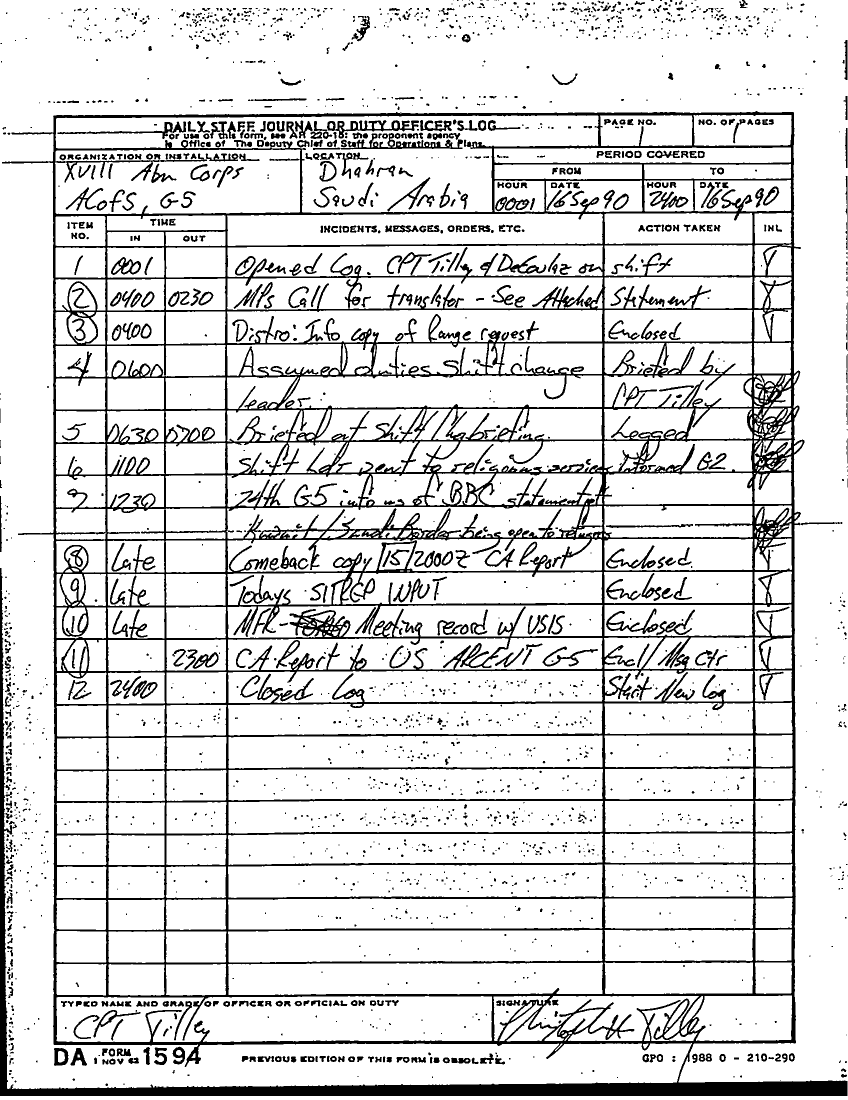 Subject = DAILY STAFF JOURNAL OR DUTY OFFICERS LOG 16 SEP 90