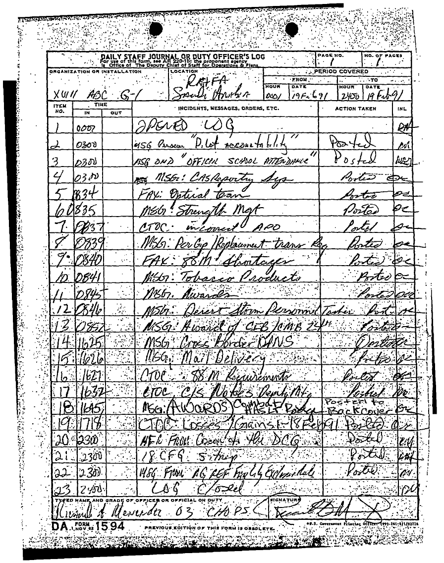 Document 31 f:/Week-16/BX000006/DUTY LOG G1 11-20 FEB 91/daily staff journal or duty officers log:05309618571751