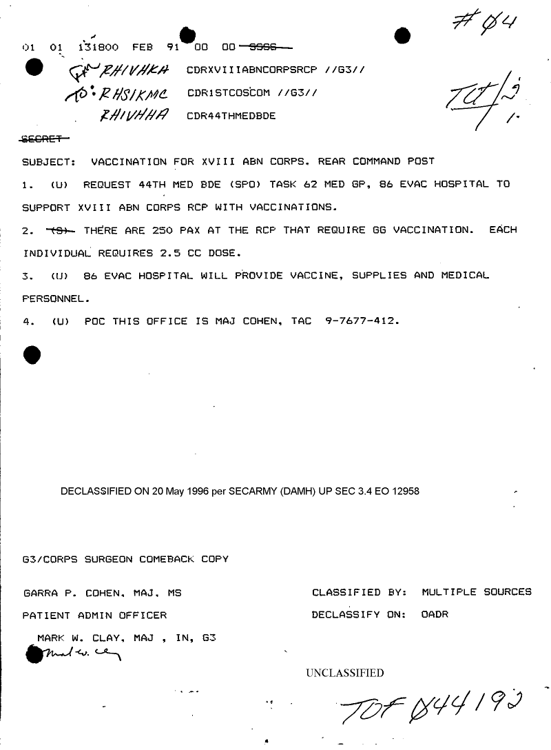 Document 1 f:/Week-10/BX000020/DUTY LOG G3 REAR OUTGOING MSG 16 JAN - 19 FEB 91/message vaccination for xviii corps rcp:05319611394124