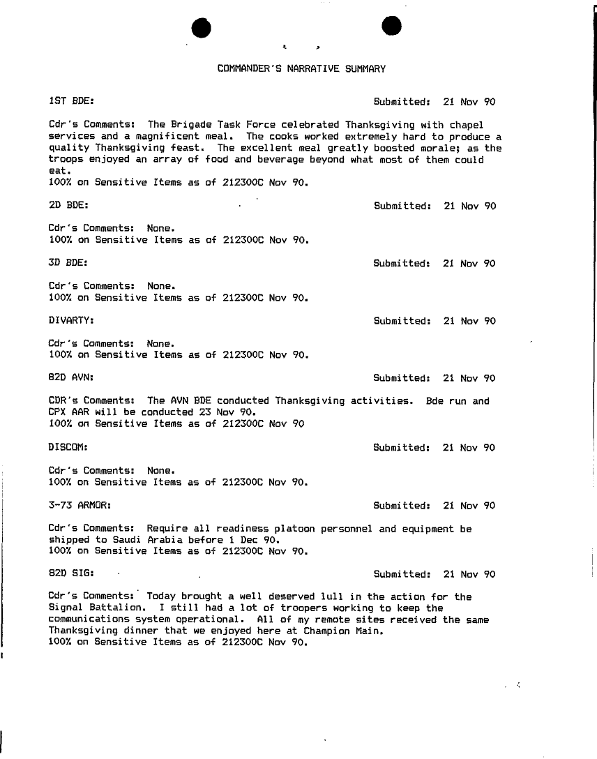 Subject = COMMANDERS NARRATIVE SUMMARIES NOV 90