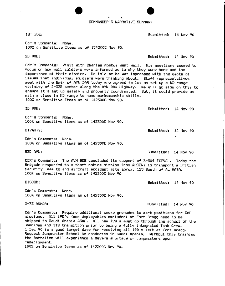 Subject = COMMANDERS NARRATIVE SUMMARIES NOV 90