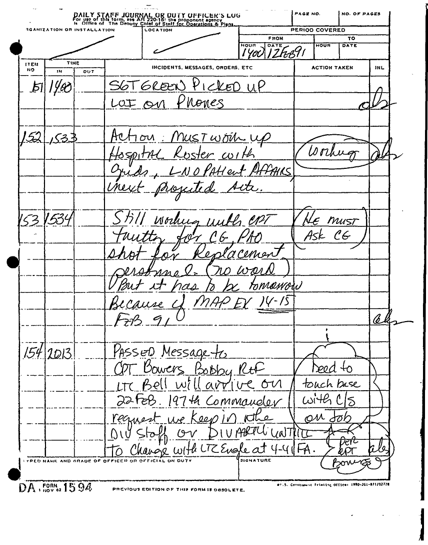 Document 135 f:/Week-22/BX001433/MESSAGE-TELEPHONE TRAFFIC/daily staff journal or duty officers log:06219615521613