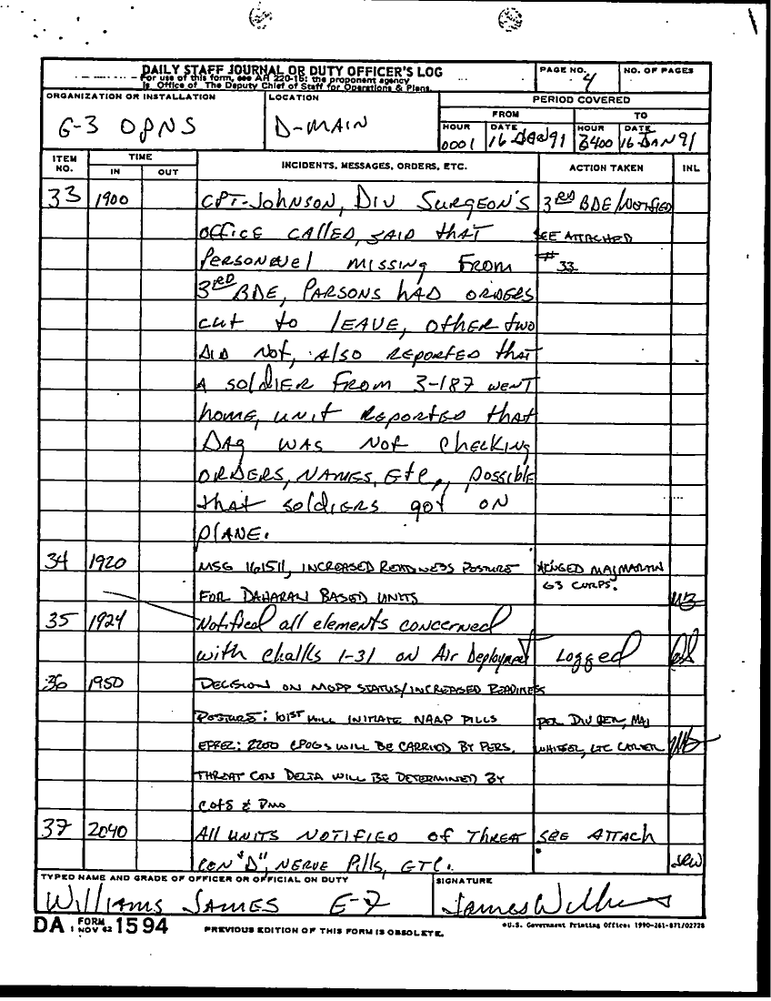 Document 5 f:/Week-22/BX001605/101ST ABN DIV AASLT DUTY LOG JAN 91-B/daily staff journal or duty officers log 16 jan :07019618410168