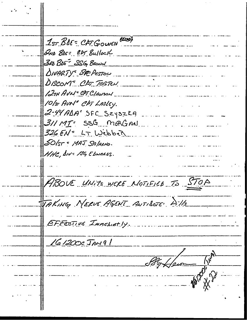 Document 1 f:/Week-22/BX001605/101ST ABN DIV AASLT DUTY LOG JAN 91-B/taking nerve agent antidote pills:07019618410270