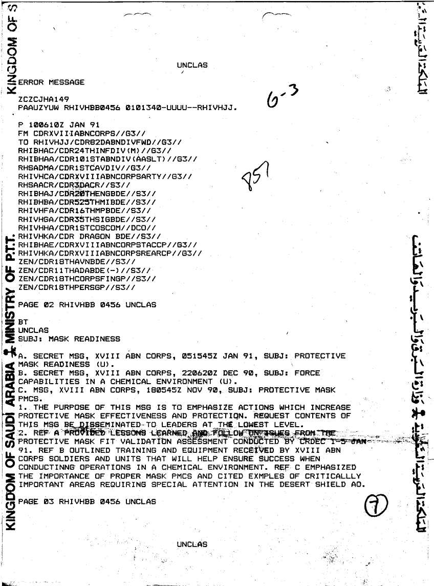 Document 3 f:/Week-22/BX001501/DUTY LOG G3 OPS 11-12 Jan 91/mask readiness xviii abn corps 10 jan 91:07199610185726