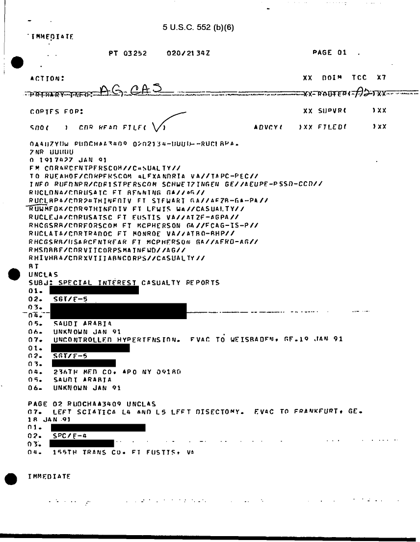 Document 2 f:/Week-20/BX001419/INCOMING DESRT SHIELD MESSAGES MEDDAC JAN - 2/special interest casualty reports 19 jan 91:07199610202477
