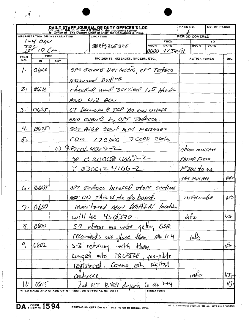 Document 14 f:/Week-27/BX001034/DAILY JOURNAL-STAFF JOURNAL AND TACTICAL OPERATIONS CENTER -TOC- LOGS DESERT STORM 17 JAN 91/daily staff journal:08099611154333