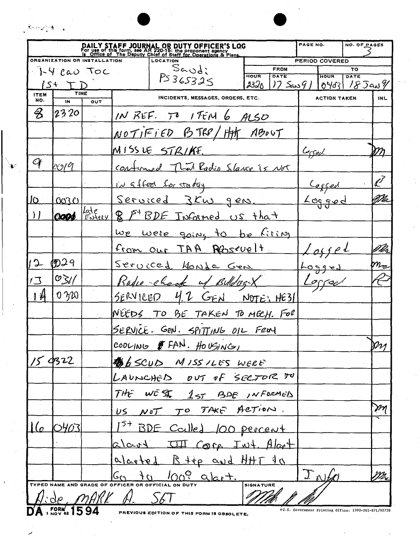 Folder Title = DAILY JOURNAL-STAFF JOURNAL AND TACTICAL OPERATIONS CENTER -TOC- LOGS DESERT STORM 17 JAN 91
