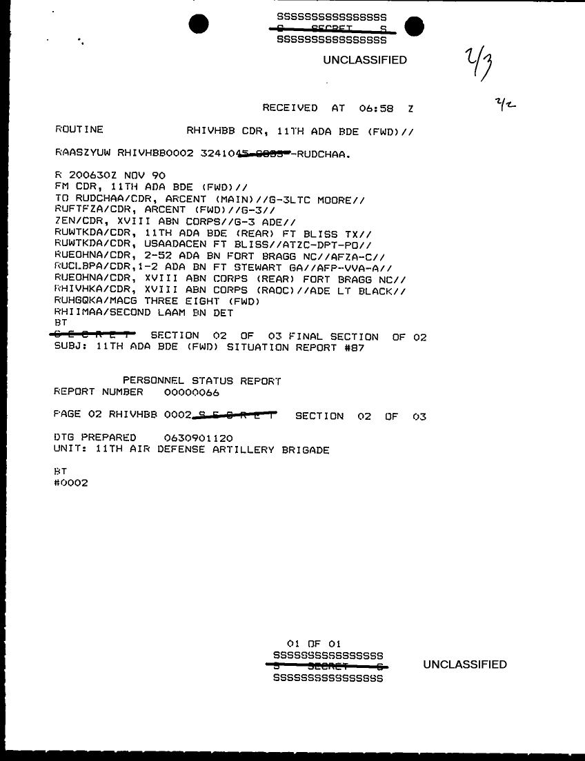 Document 11 f:/Week-29/BX000429/TACTICAL OPERATIONS CENTER LOGS - MSG FILE LOGS 23 NOV 90/11th ada bde situation report 87:08169613342730