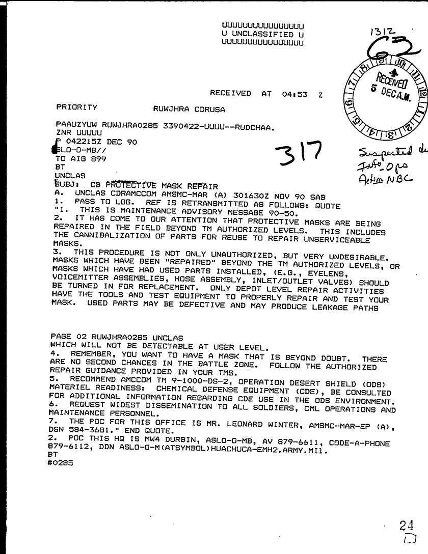 Document 1 f:/Week-29/BX000420/NBC MISCELLANEOUS INFORMATION/cb protective mask repair:08169613343033