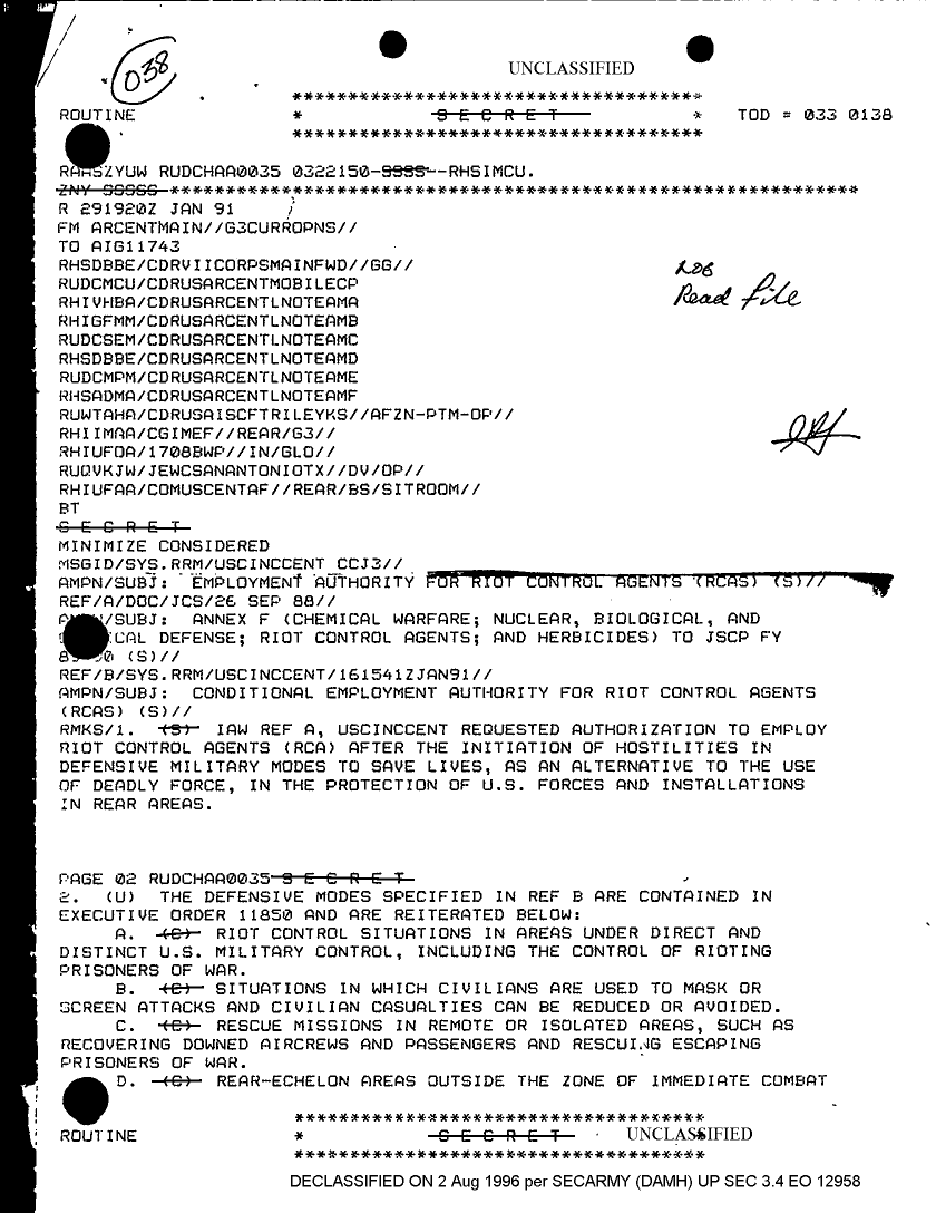 Document 2 f:/Week-28/BX000410/TACTICAL OPERATIONS CENTER LOGS - LUCKY TAC JOURNALS 1-3 FEB 91/employment authority for riot control agents:08169613340310