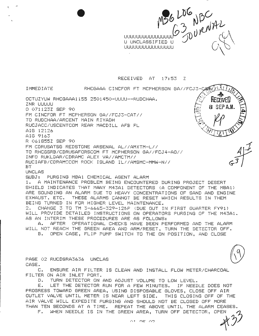 Document 2 f:/Week-30/BX000439/TOC LOGS MSG FILE LOGS 8 SEP 90 PART I/purging mba chemical agent alarm 7 sep 90:08239614362738
