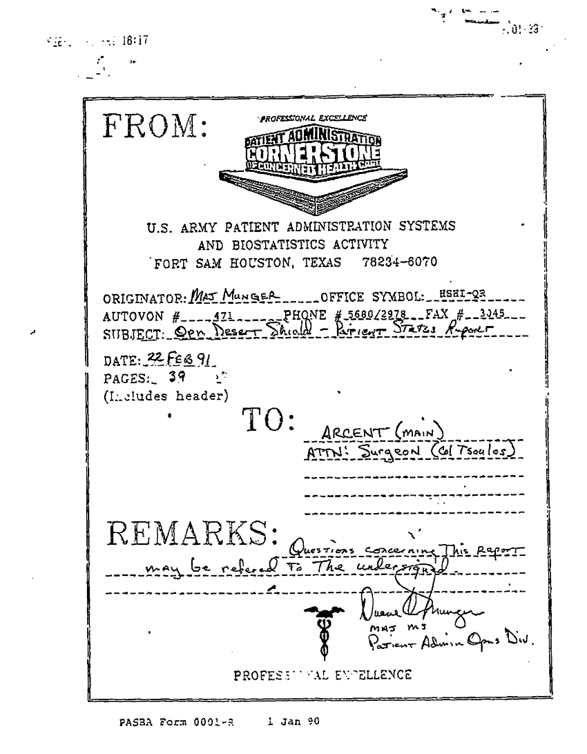 Document 38 f:/Week-31/BX000460/MEDSTAT-SITREPS - FEBRUARY - 2/ods patient status report 22feb91:09139616121511