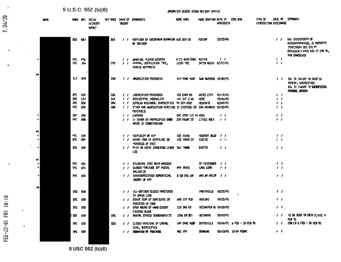 Document 38 f:/Week-31/BX000460/MEDSTAT-SITREPS - FEBRUARY - 2/ods patient status report 22feb91:09139616121511
