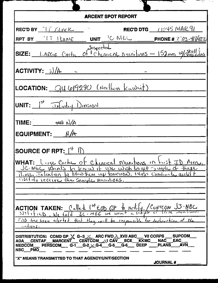 Subject = LARGE CACHE OF SUSPECTED CHEMICAL MUNITIONS