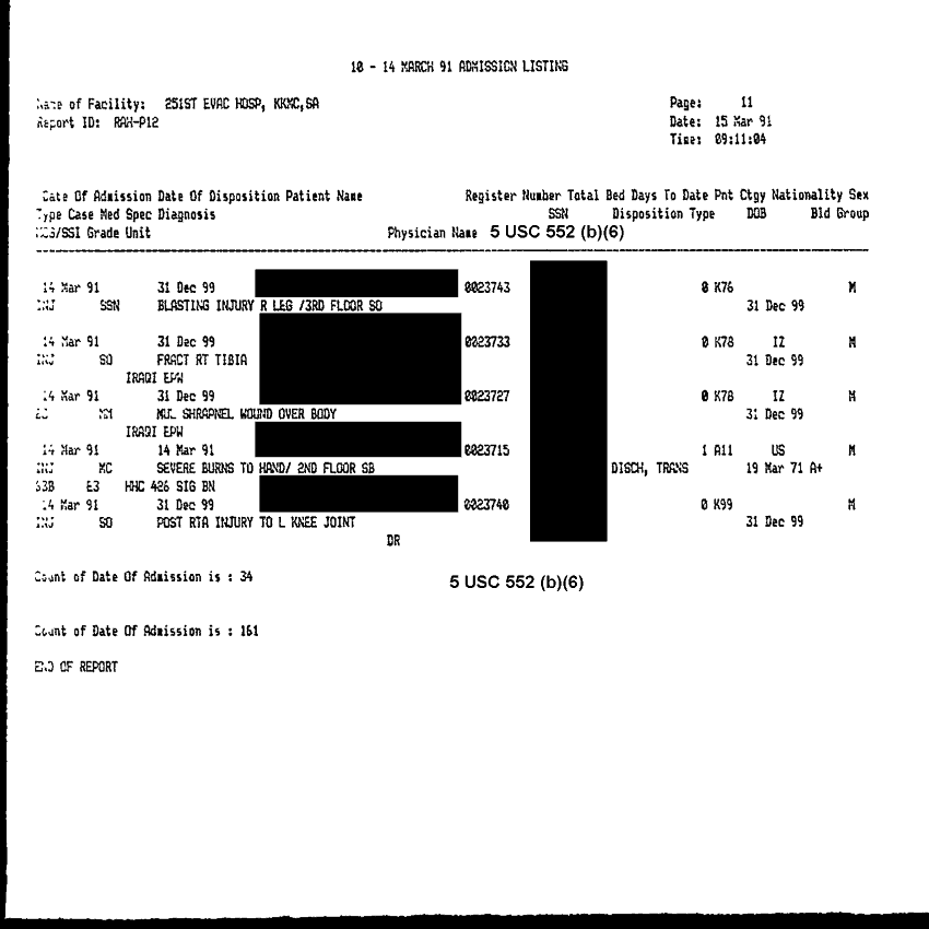 Document 11 f:/Week-32/BX000483/MEDSTAT - SITREPS APR 91 -3/patient admission listing 15 mar 91:0906961405383