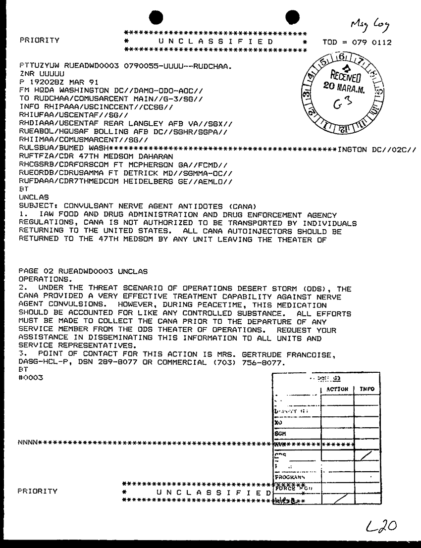 Document 1 f:/Week-31/BX000438/TOC LOGS MSG FILE LOGS 18-20 MAR91/convulsant nerve agent antidotes:09069615152719