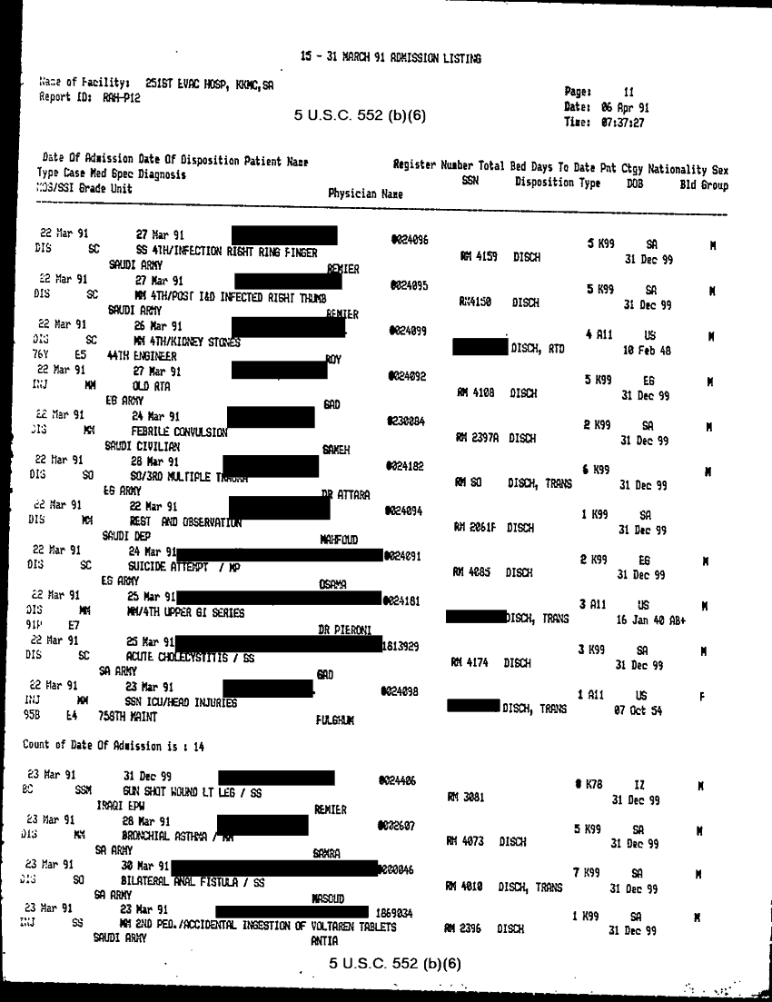 Document 28 f:/Week-32/BX000483/MEDSTAT - SITREPS APR 91 -3/patient adimission listing 15 31 mar 91:09069615155346