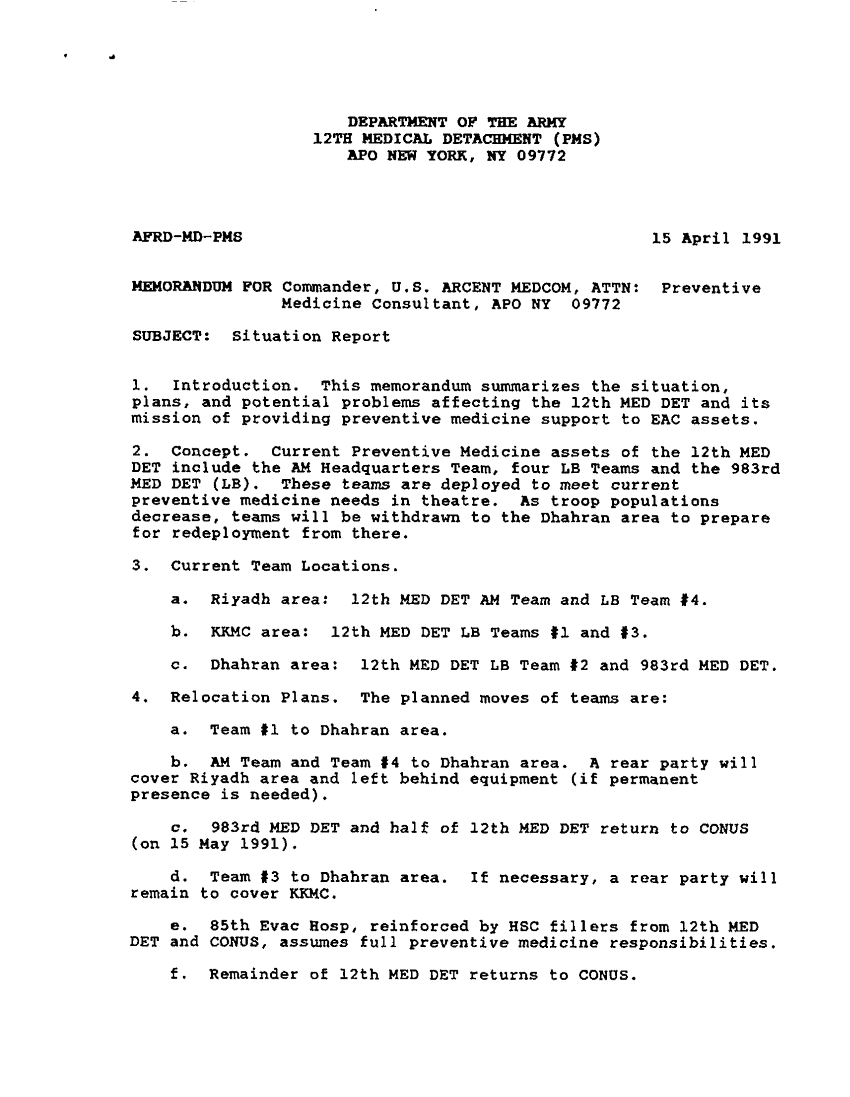 Document 2 f:/Week-34/BX005154/PREVENTIVE MEDICINE-ENVIRONMENTAL THREAT-USAEHA/situation report 12th med det pms 15 apr 91:09209615584373