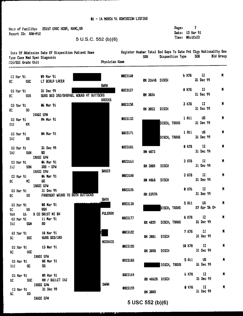 Document 30 f:/Week-32/BX000483/MEDSTAT - SITREPS APR 91 -3/patient admission listing 15 mar 91:092096155910117