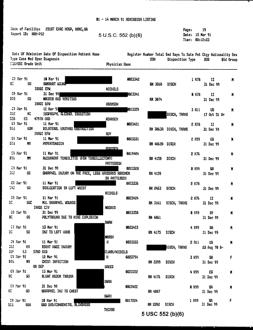 Document 30 f:/Week-32/BX000483/MEDSTAT - SITREPS APR 91 -3/patient admission listing 15 mar 91:092096155910117