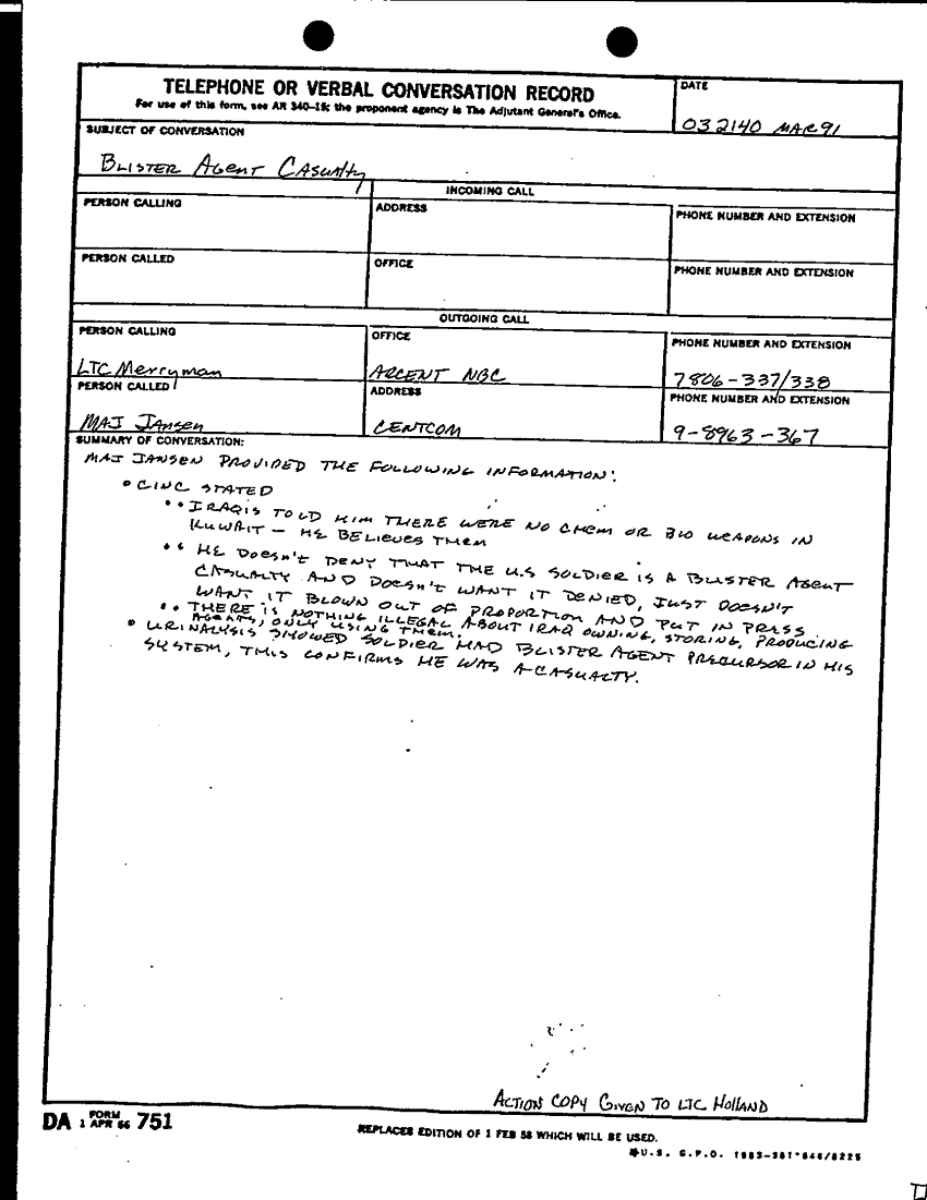 Subject = BLISTER AGENT CASUALTY 3 MAR 91