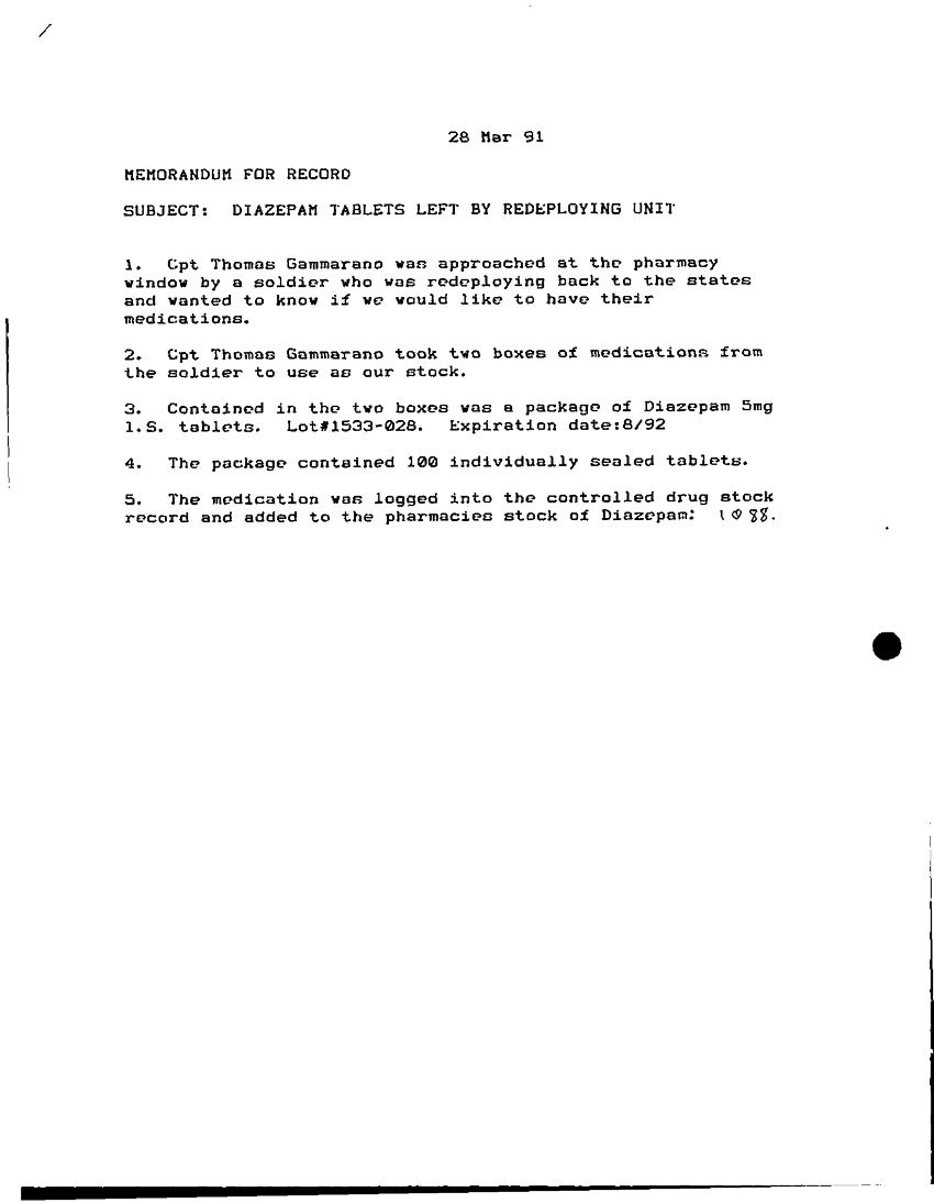 Subject = DIAZEPAM TABLETS LEFT BY REDEPLOYING UNIT 28 MA
