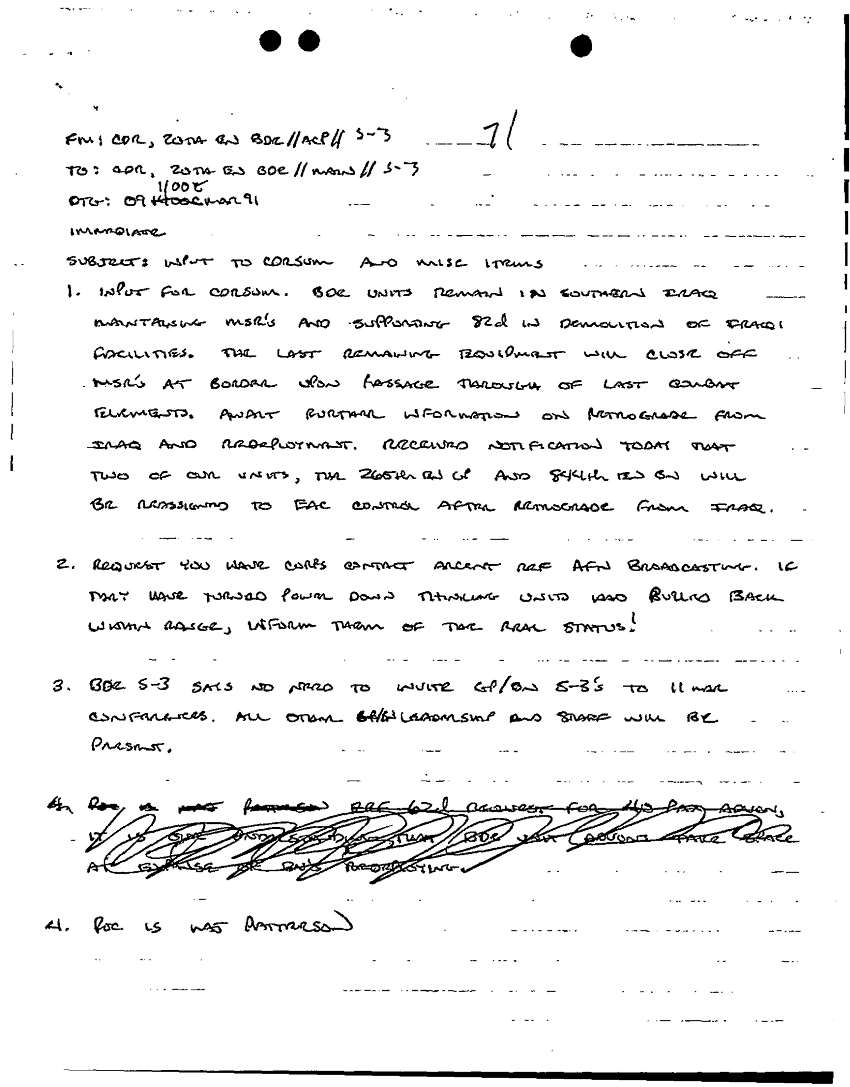 Document 3 f:/Week-18/BX000057/DUTY LOG MAIN CP MESSAGES 20 ENGINEER BDE 9 MAR 91/input to corsum and misc items:10119615410337