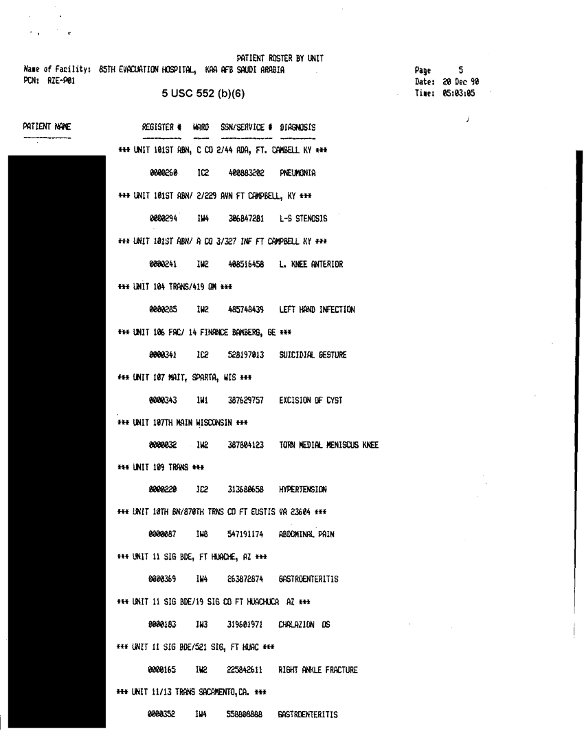 Document 30 f:/Week-32/BX000482/MEDSTAT - SITREPS DEC 90 2 OF 6/patient roster by unit 85th evac hospital 20 d:10119615412450