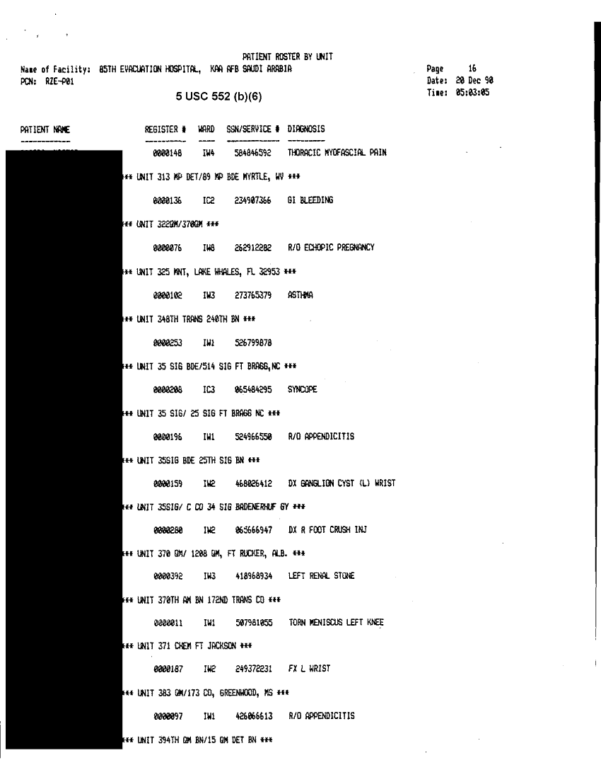 Document 30 f:/Week-32/BX000482/MEDSTAT - SITREPS DEC 90 2 OF 6/patient roster by unit 85th evac hospital 20 d:10119615412450