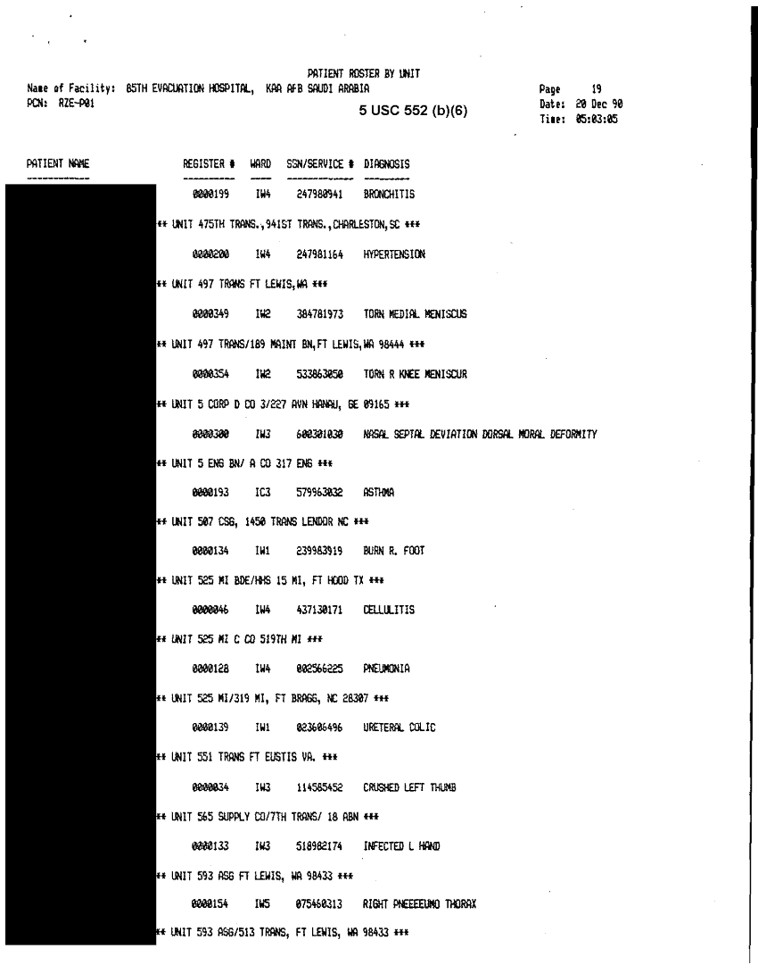 Document 30 f:/Week-32/BX000482/MEDSTAT - SITREPS DEC 90 2 OF 6/patient roster by unit 85th evac hospital 20 d:10119615412450