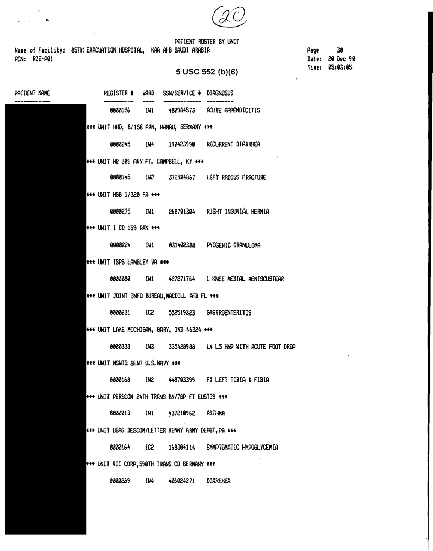 Document 30 f:/Week-32/BX000482/MEDSTAT - SITREPS DEC 90 2 OF 6/patient roster by unit 85th evac hospital 20 d:10119615412450