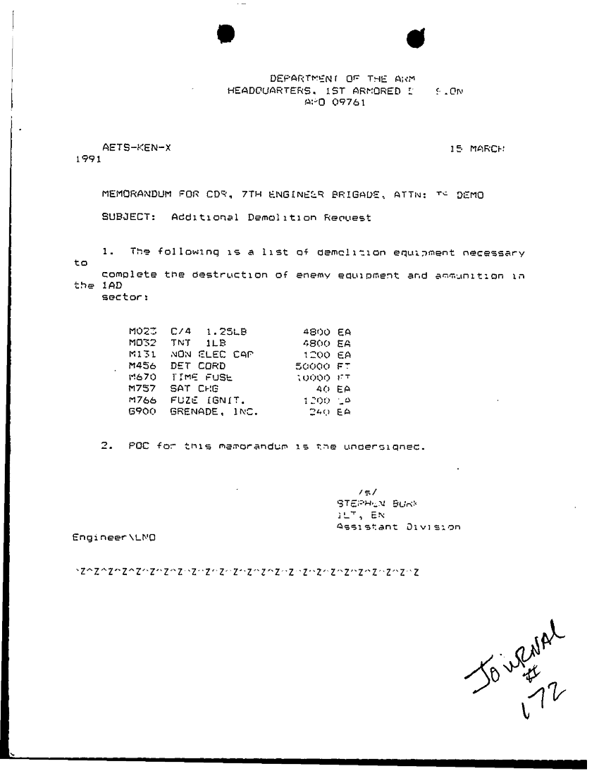 Document 1 f:/Week-24/BX000211/TASK FORCE DEMO LOG 14 MAR- 1 APR 91/additional demolition request:10119615420987