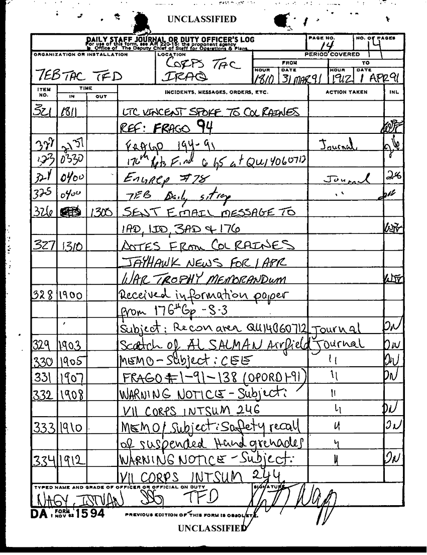 Document 14 f:/Week-24/BX000211/TASK FORCE DEMO LOG 14 MAR- 1 APR 91/daily staff journal or duty officers log:10119615421190
