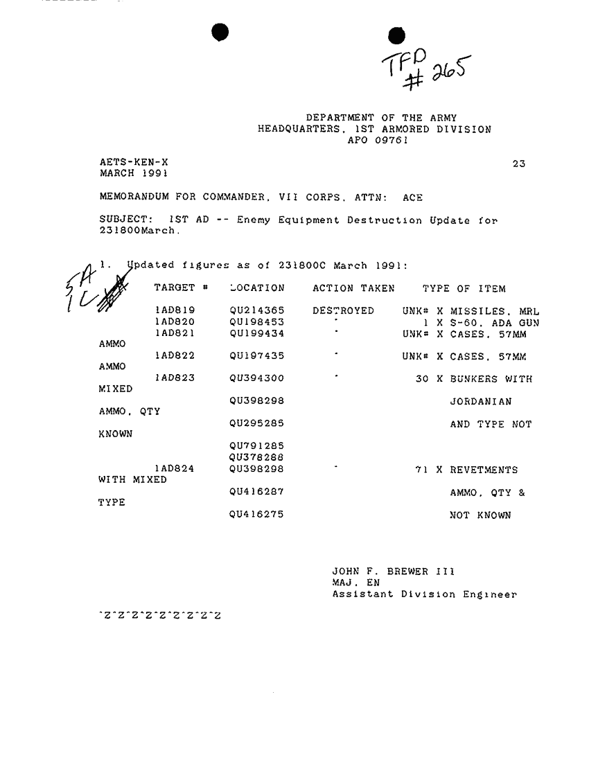 Subject = 1ST AD ENEMY EQUIPMENT DESTRUCTION UPDATE FOR 23