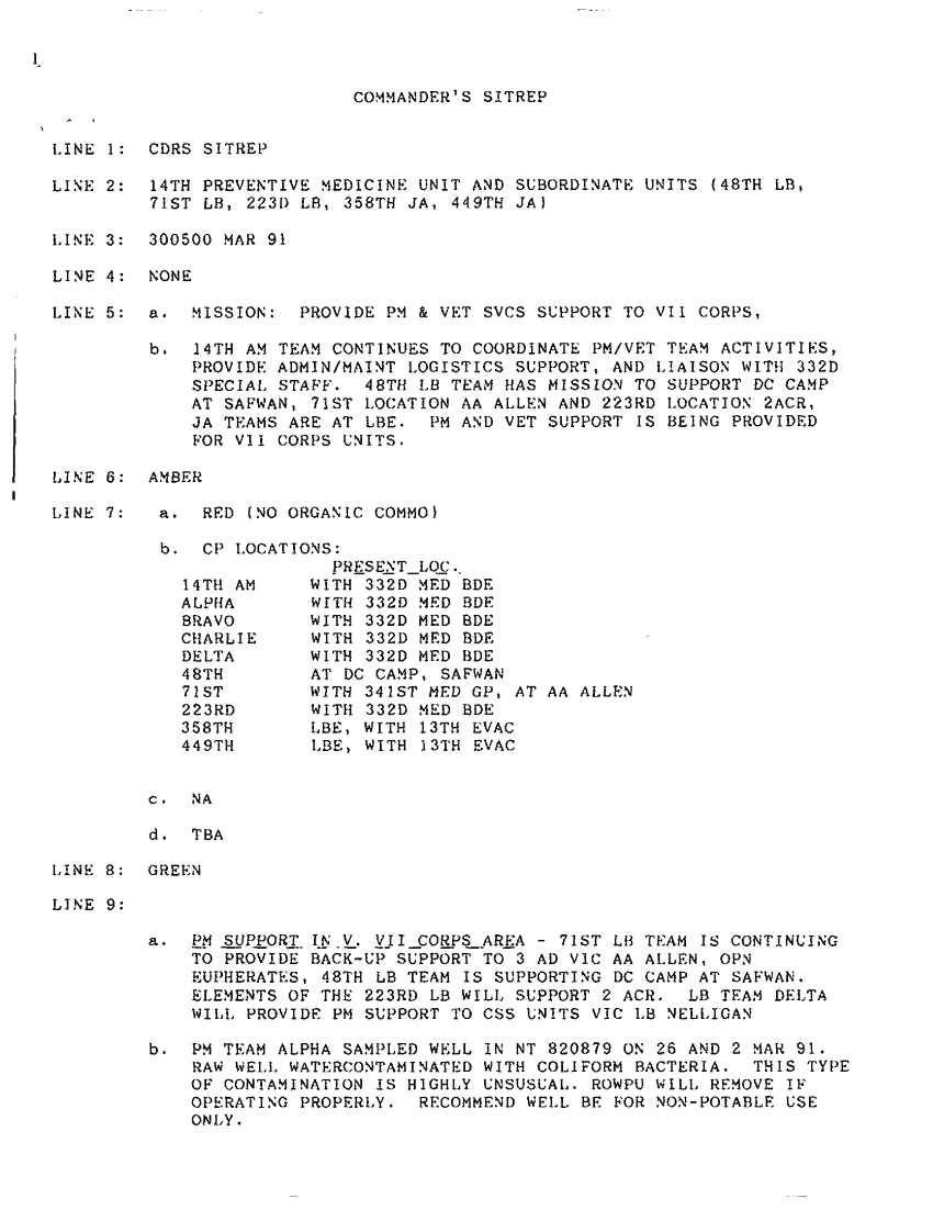 Document 2 f:/Week-34/BX005159/SITUATION REPORTS-DECLASSIFIED-MAR THRU APR 91-2/commanders sitrep 14th preventive medicine 30 ma:10019616510888