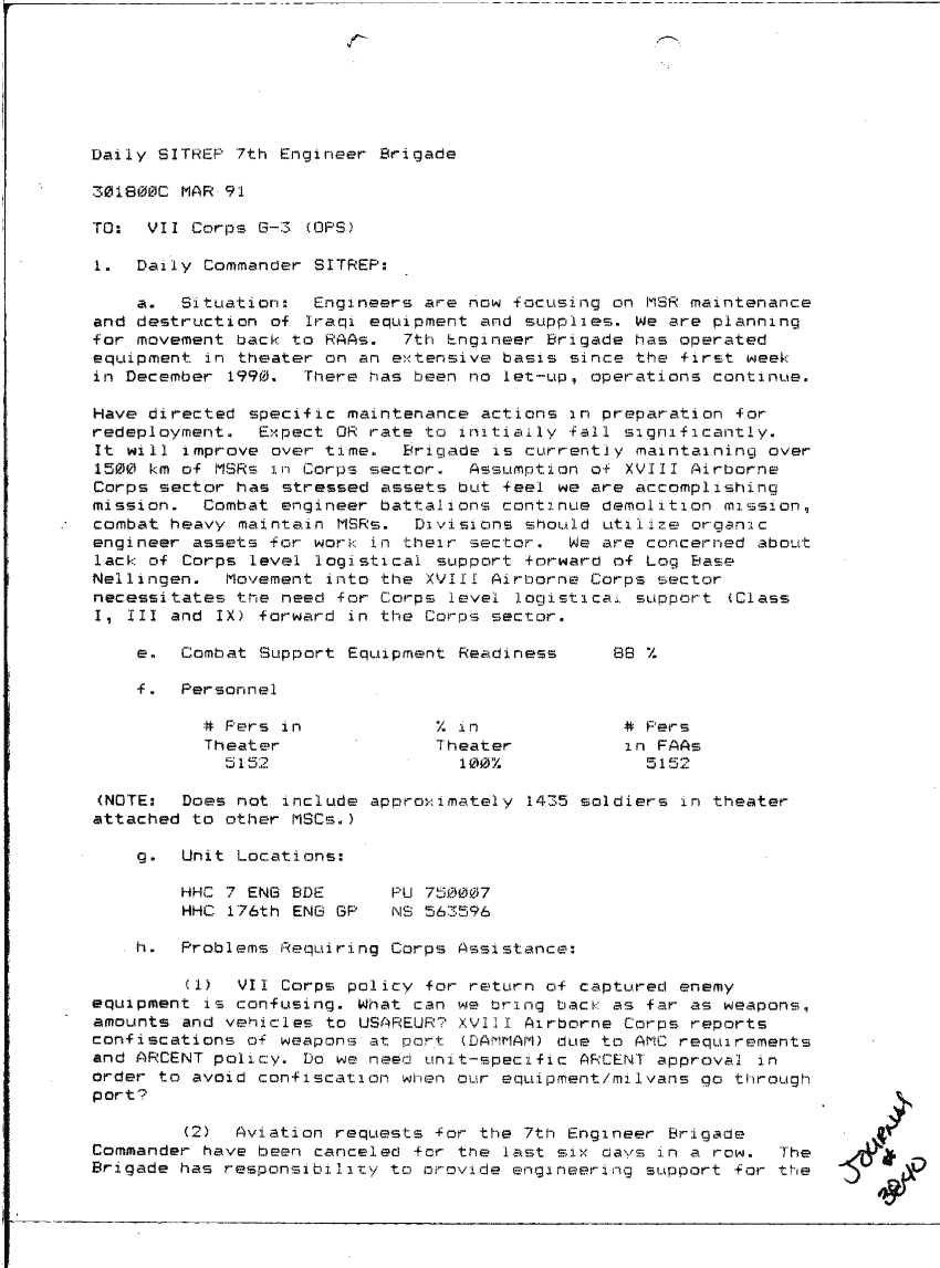 Document 87 f:/Week-24/BX000213/SITUATION REPORTS 7TH ENG BDE 22 DEC 90- 10 APR 91/daily commander sitrep:10019616504540