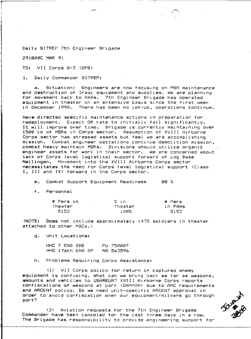 Document 87 f:/Week-24/BX000213/SITUATION REPORTS 7TH ENG BDE 22 DEC 90- 10 APR 91/daily commander sitrep:10019616504540