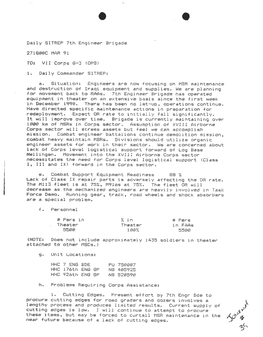 Document 87 f:/Week-24/BX000213/SITUATION REPORTS 7TH ENG BDE 22 DEC 90- 10 APR 91/daily commander sitrep:10019616504540