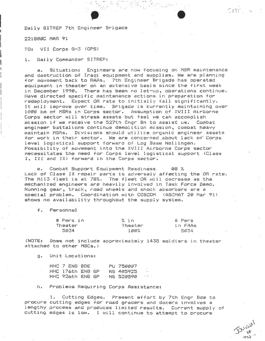Document 87 f:/Week-24/BX000213/SITUATION REPORTS 7TH ENG BDE 22 DEC 90- 10 APR 91/daily commander sitrep:10019616504540