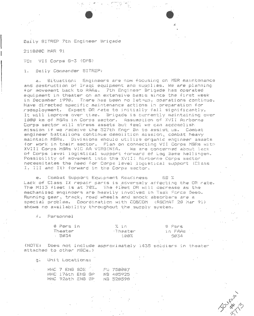 Document 87 f:/Week-24/BX000213/SITUATION REPORTS 7TH ENG BDE 22 DEC 90- 10 APR 91/daily commander sitrep:10019616504540