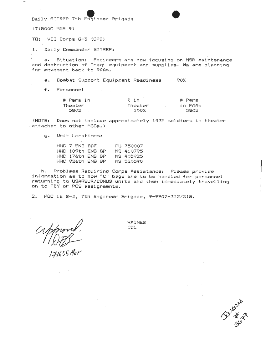 Document 87 f:/Week-24/BX000213/SITUATION REPORTS 7TH ENG BDE 22 DEC 90- 10 APR 91/daily commander sitrep:10019616504540