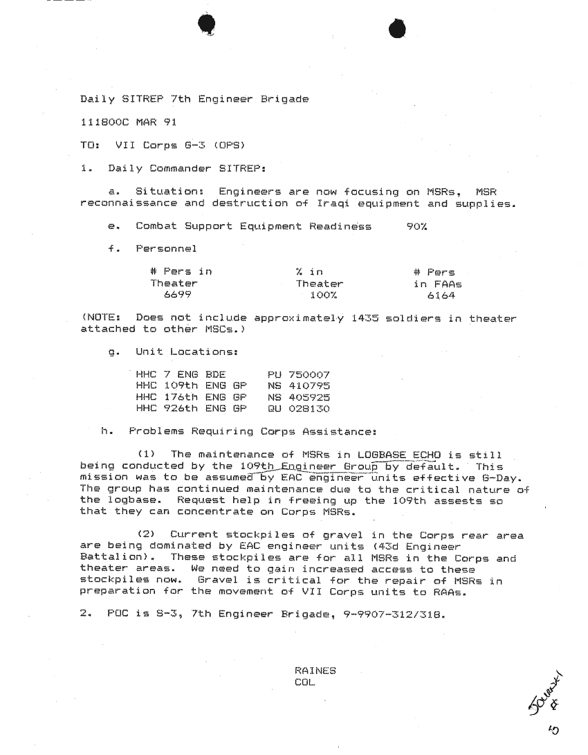 Document 87 f:/Week-24/BX000213/SITUATION REPORTS 7TH ENG BDE 22 DEC 90- 10 APR 91/daily commander sitrep:10259613090426