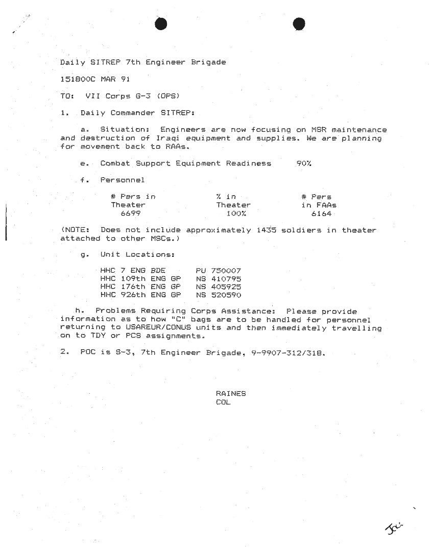 Document 87 f:/Week-24/BX000213/SITUATION REPORTS 7TH ENG BDE 22 DEC 90- 10 APR 91/daily commander sitrep:10259613090426