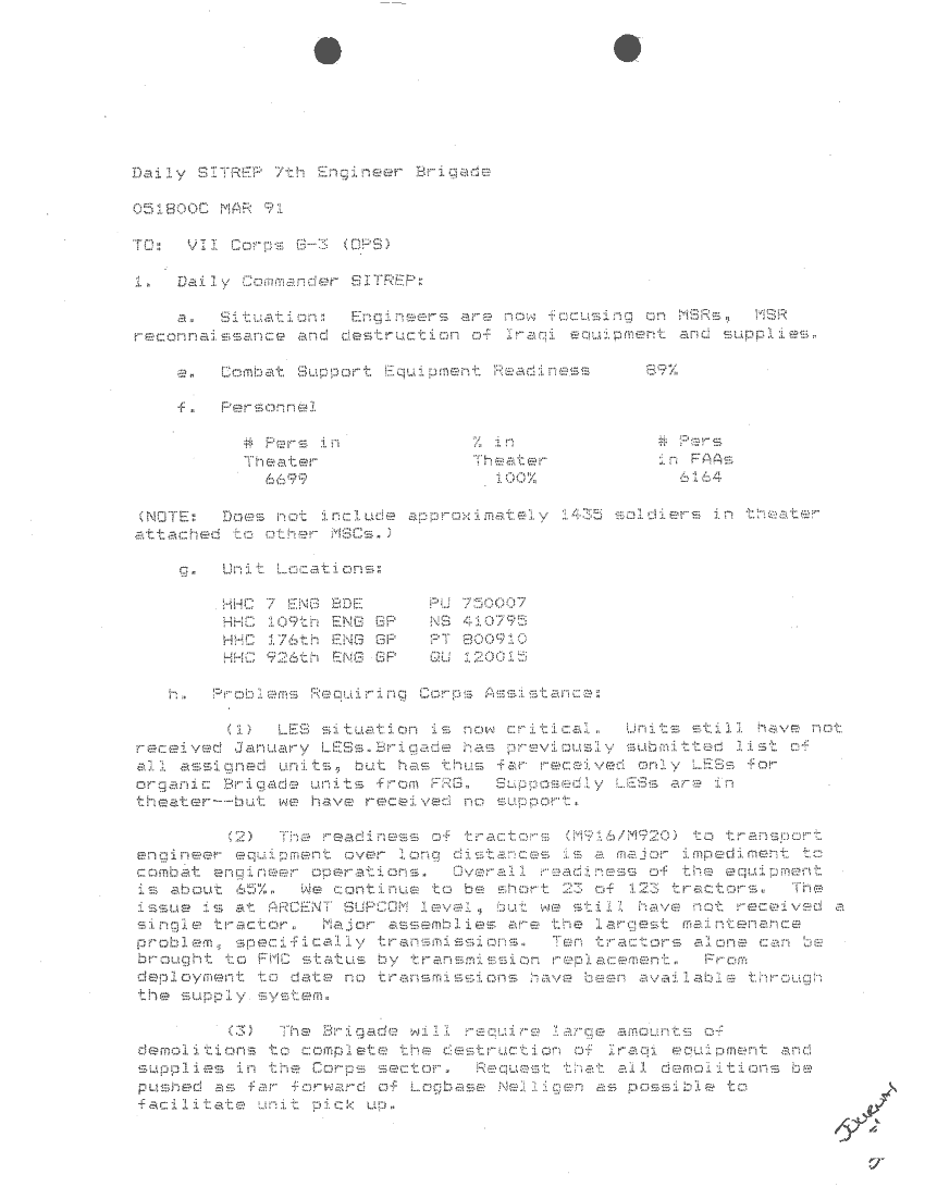 Document 87 f:/Week-24/BX000213/SITUATION REPORTS 7TH ENG BDE 22 DEC 90- 10 APR 91/daily commander sitrep:10259613090426
